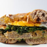 - Layer the sausage if using, kale and egg on top. of the sandwich base. You can also skip the sausage and egg and just just double down on kale, almond butter and avocado for a vegan option!